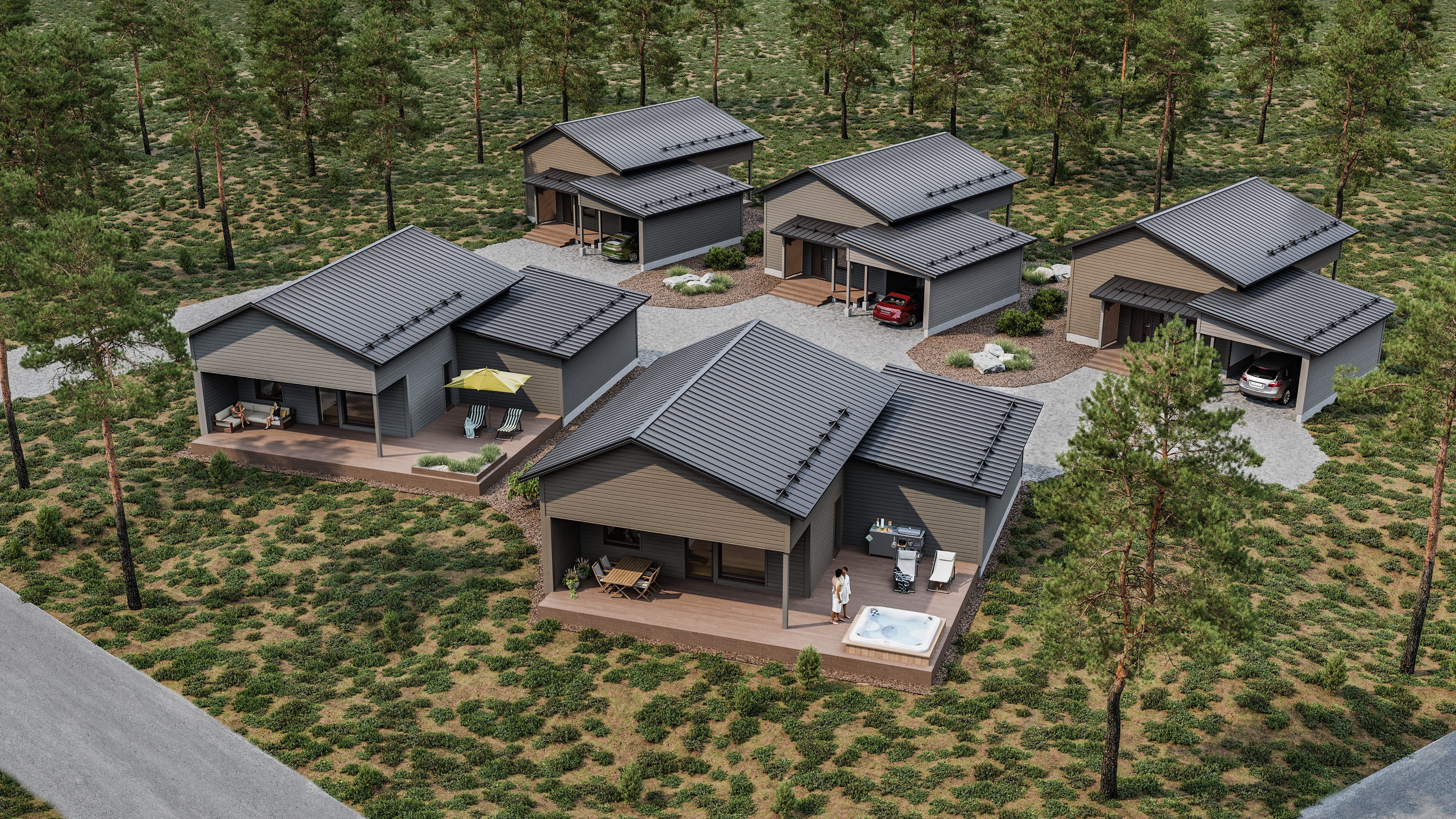 Uusi viiden erillistalon kokonaisuus. Loistava vaihtoehto kompaktia kotia tai vapaa-ajan asuntoa etsivälle. Asunnossa kaksi makuuhuonetta, tupakeittiö, pesuhuone kodinhoitotilalla sekä oma sauna. Asunnon yhteydessä autokatospaikka, tilava lämpöeristetty varasto ja katettu terassi.