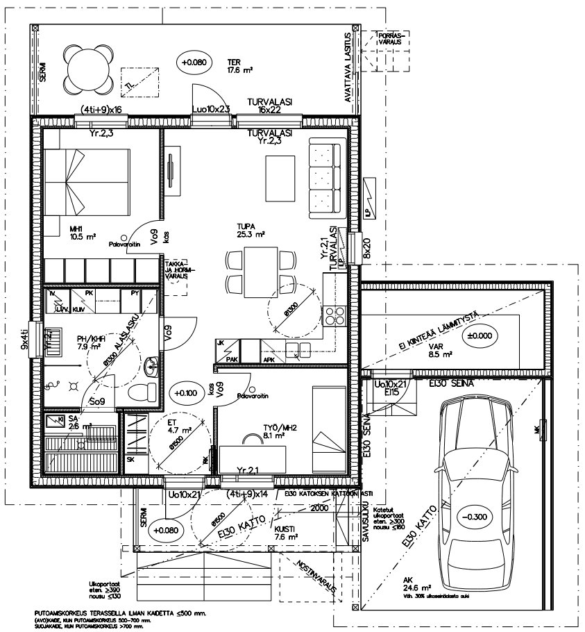 - Huoneistoala 61,5m², varasto 8,5m². Kokonais kerrosala autokatoksen kanssa 107m².