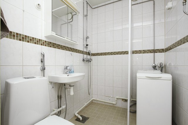 - WC-istuin, suihku, suihkuseinä, pesukoneliitäntä, pesuallas, ja peilikaappi