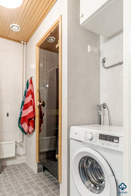 - Laatoitettu. Käsienpesuallas, kaapisto, peilikaappi, wc-istuin, pesukoneliitäntä. Pesutiloissa lattialämmitys.