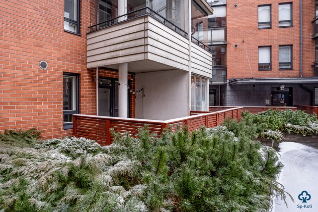 - Tilava patio taloyhtiön sisäpihalle päin, ilmansuunta koillinen.