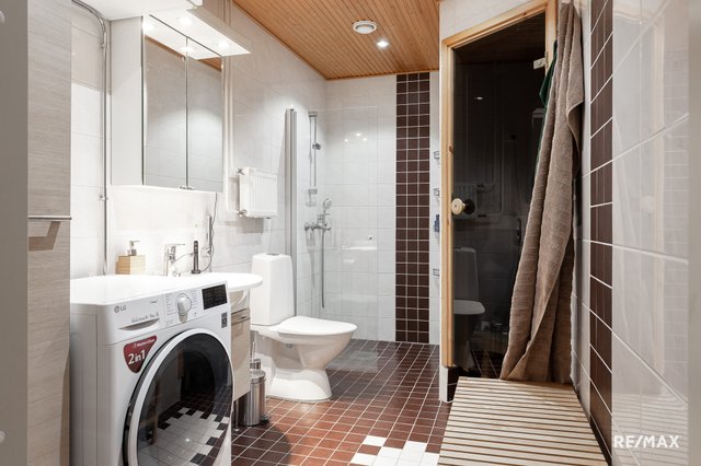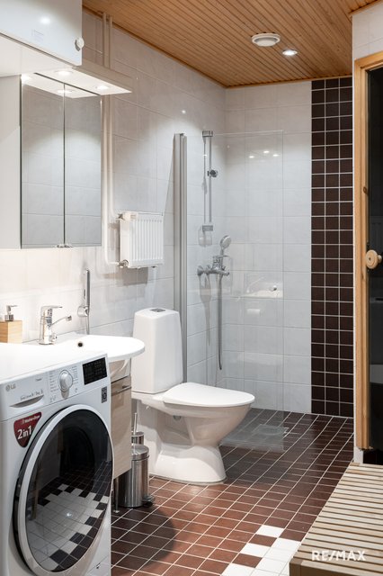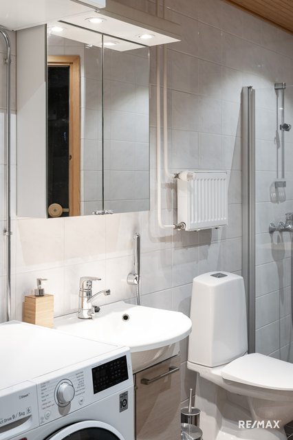 - WC-istuin, suihku, suihkuseinä, lattialämmitys, pesukoneliitäntä, peilikaappi, pesuallas, allaskaappi, ja bidee-suihku