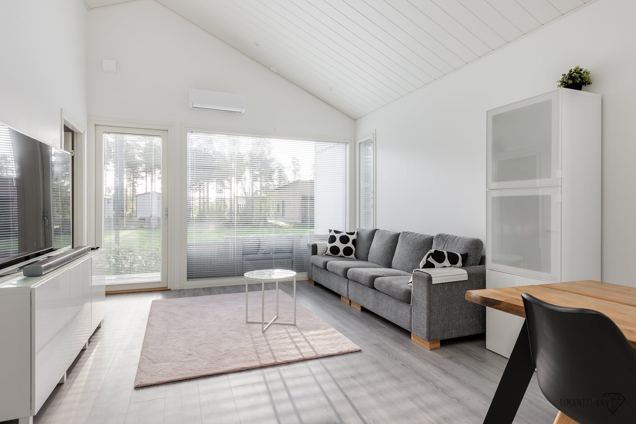 Olohuoneesta on käynti aurinkoiselle terassille. Olohuoneessa ilmalämpöpumppu pitää huoneilman raikkaana. Kodin makuuhuoneet on mukavasti erillään toisistaan ja toisessa makuhuoneessa on käytännöllisyyttä lisäävä vaatehuone. Vaatehuone soveltuu hyvin myös vaikkapa etätyöpisteeksi.