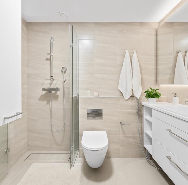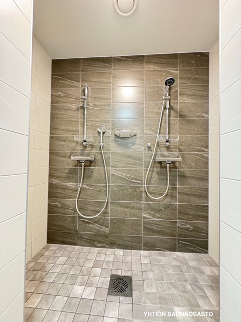 - Tilava kylpyhuone, jossa on tyylikäs laatoitus, seinä-wc, bideesuihku, lattia mukavuus-lämmitys, iso peili led-valoin, suihkunurkkaus, runsaasti kaappitilaa ja laskutasoa, paikka pesukoneelle. Lattiat 600 x 600 laattaa ja seinät 450 x 200 kaakelia.