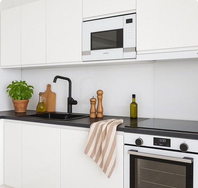 - Keittiö on varusteltu laadukkailla Siemens kodinkoneilla: Jääkaappi, pakastin, uuni, induktioliesi, astianpesukone, mikroaaltouuni. Työtasot ovat laminaattia. Parkettilattia ja seinät maalattu.