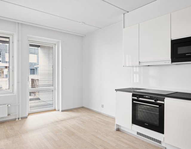 - Keittiö on varusteltu laadukkailla Siemens kodinkoneilla: Jääkaappi / pakastin, uuni, induktioliesi, astianpesukone, mikroaaltouuni. Työtasot ovat laminaattia. Parkettilattia ja seinät on maalattu.