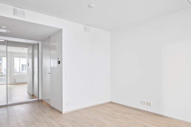 - Olohuoneessa on parkettilattia ja seinät on maalattu.