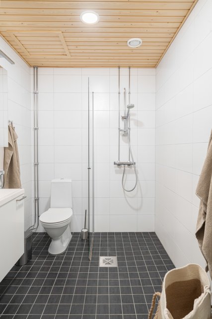 - WC-istuin, suihku, pesukoneliitäntä, allaskaappi, ja lattialämmitys