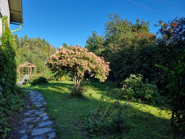 Kaunis ja vehreä piha kutsuu viihtymään – täällä on tilaa niin lasten leikkiä kuin jatkaa puutarhaharrastusta.