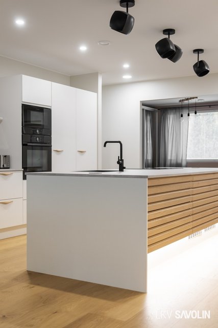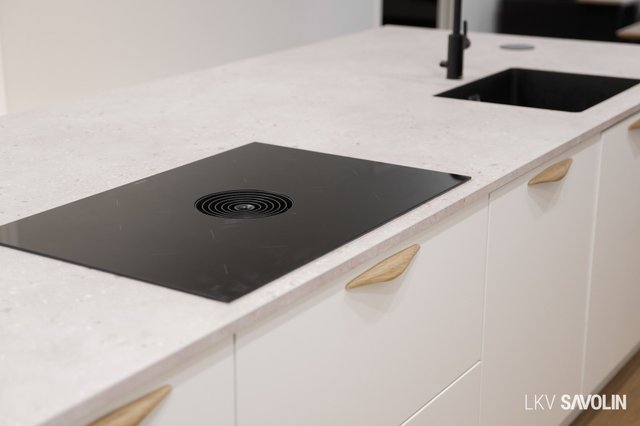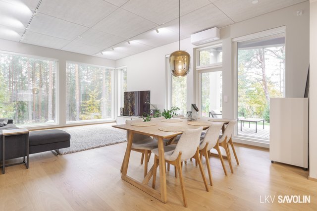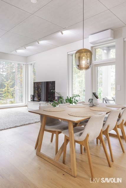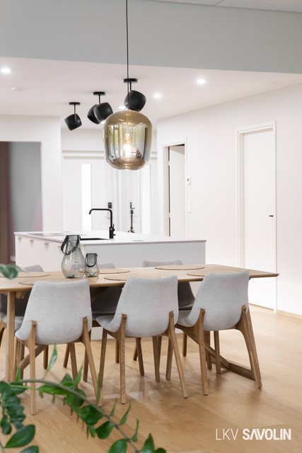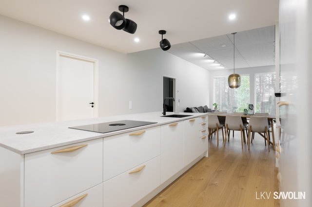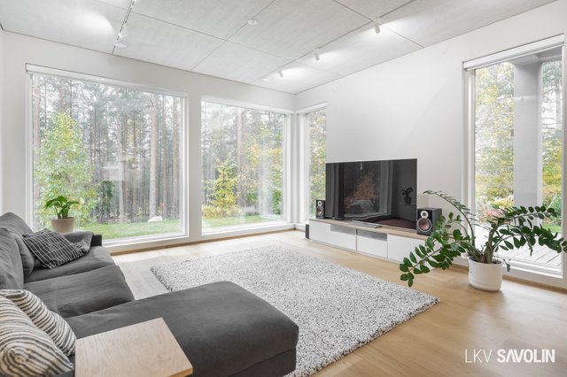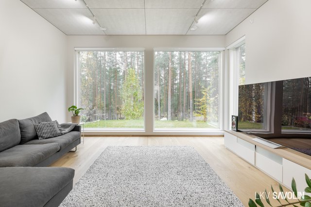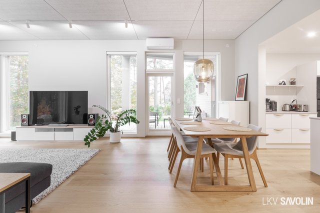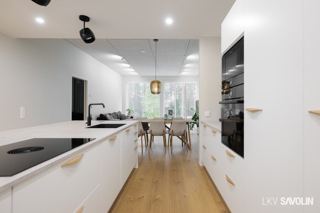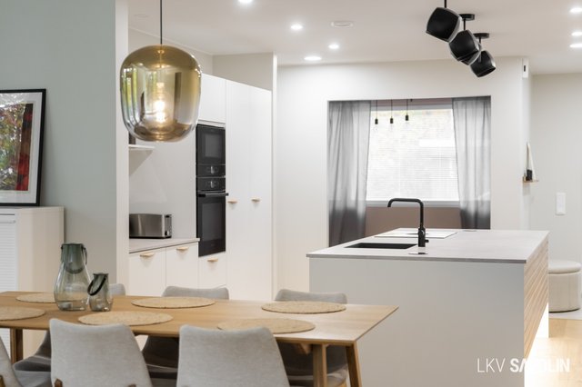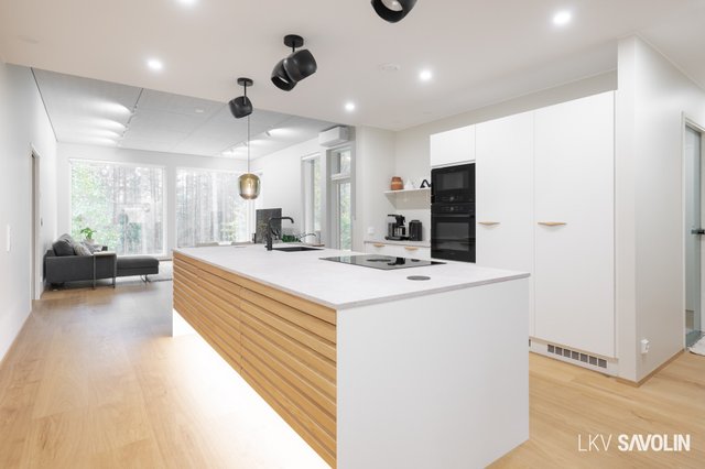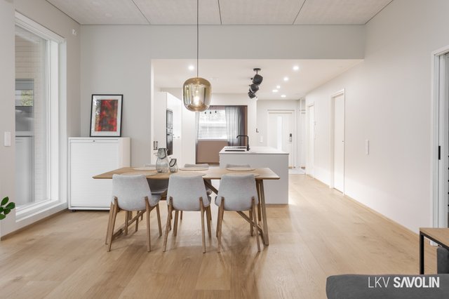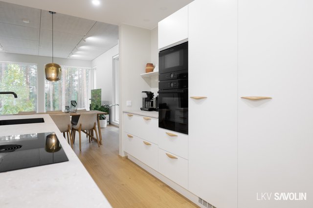 Jo sisään astuessa huomaat tilan avaruuden, korkean huonekorkeuden ja suurista ikkunoista tulvivan luonnonvalon. Avara ja valoisa olohuone yhdistyy saumattomasti keittiöön – täydellinen tila yhdessäololle. Olohuoneen ikkunat on varustettu sähköverhoilla, ja kattoon asennetut akustolevyt takaavat rauhallisen ja miellyttävän äänimaailman. Lattioissa on laadukkaat Bjelinin kovapuupinnat.