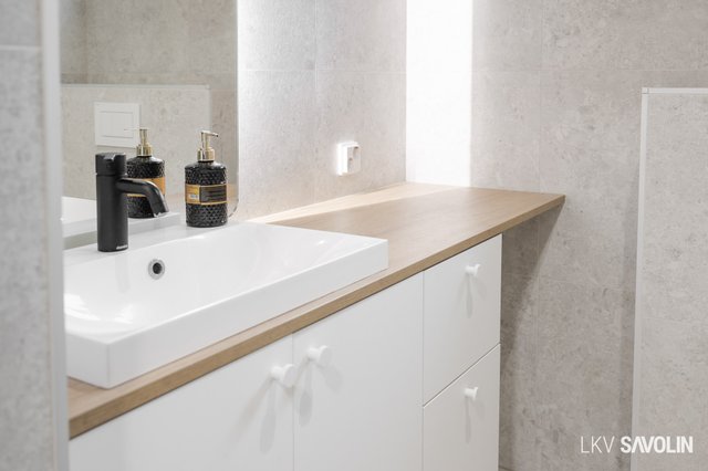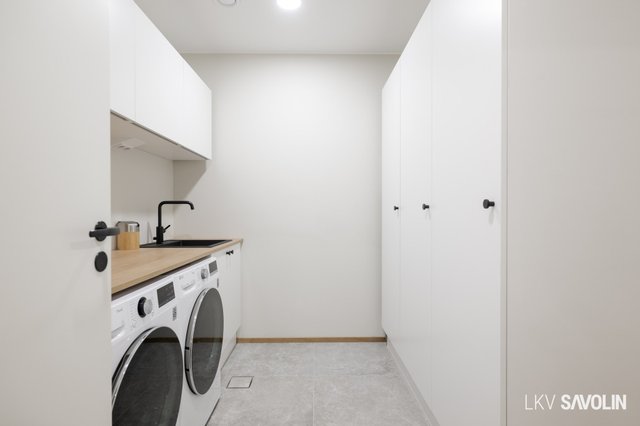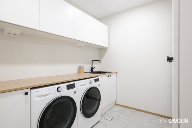 - Pesukoneliitäntä, lattiakaivo, pöytätaso, ja pyykkikaapit