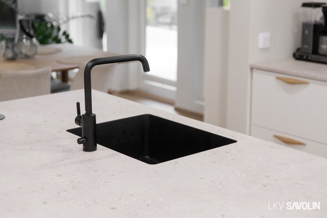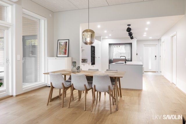 Tyylikäs ja toimiva keittiö on varustettu Keittiömaailman (A la Carte) kiintokalusteilla ja huipputason kodinkoneilla. Kodissa on kolme tilavaa makuuhuonetta, kaksi erillistä WC:tä sekä huolella suunniteltu saunaosasto, jossa arjen mukavuus on huomioitu jokaisessa yksityiskohdassa. Saunassa on laadukas Narvin kiuas ja lauteet lämpökäsiteltyä tervaleppää. Kaksi suihkua tekevät kylpyhuoneesta erityisen käytännöllisen. Kodinhoitohuoneen yhteydessä sijaitsee vaatehuone, ja kuraeteinen helpottaa arkea erityisesti lapsi- tai lemmikkiperheessä.