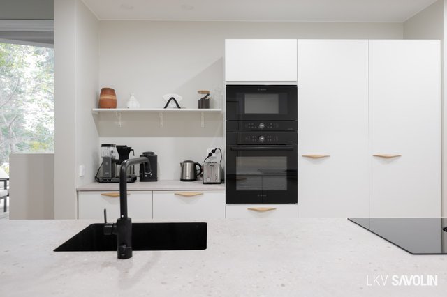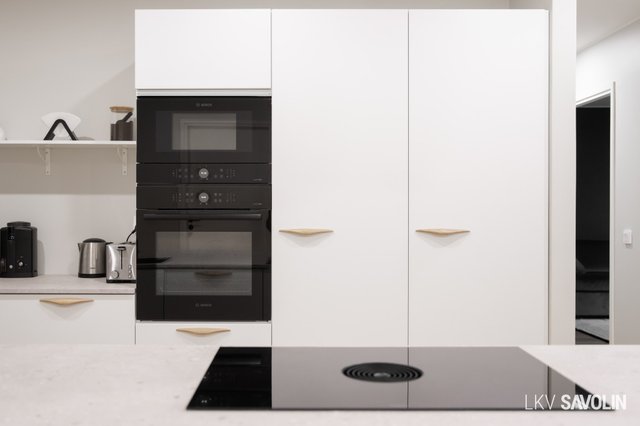- Jääkaappi (AEG), erillinen pakastin (AEG), erillisuuni (Bosch), liesi (Bora, induktiotaso liesituulettimella), mikroaaltouuni (Bosch), astianpesukone (Siemens), ja keittiösaareke