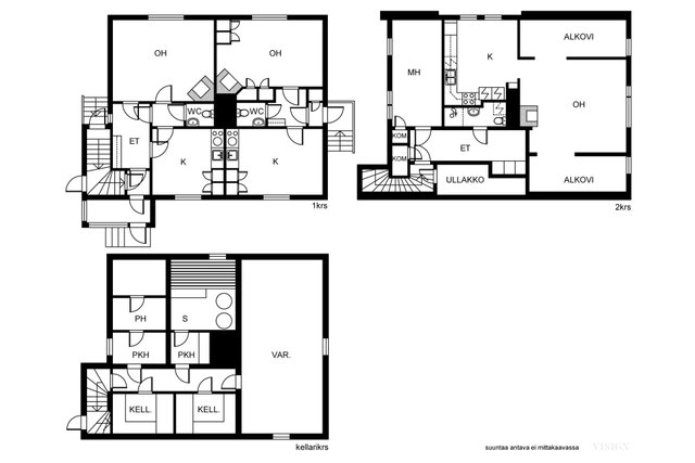5h, 3 keittiötä, 3 wc, 2 makuualkovia, kh, s, kellaritilat ja varastot