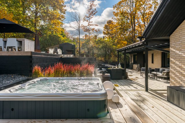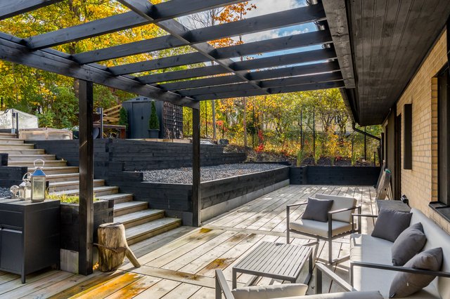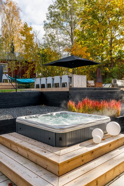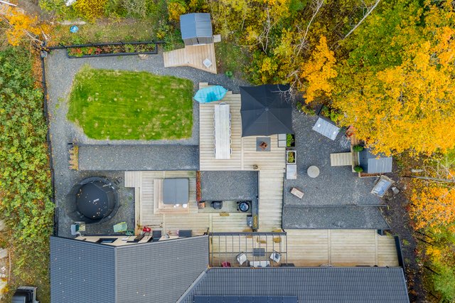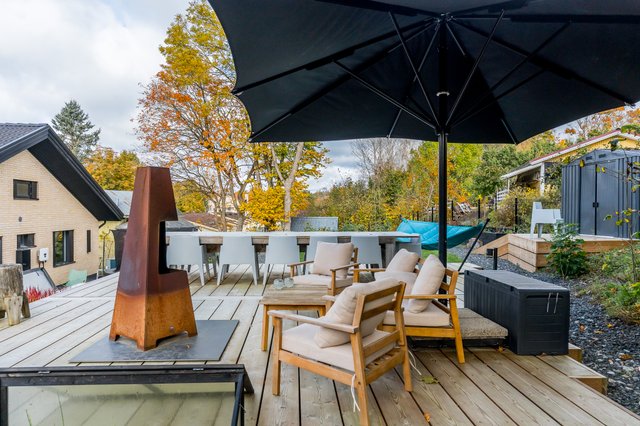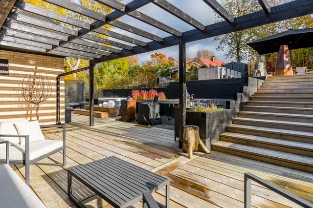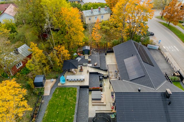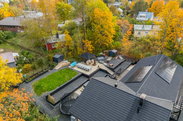 Upea takapiha valtavalla terassilla kutsuu viettämään aikaa pitkälle iltaan. Täällä kesäillat venyvät pitkälle yöhön kuin huomaamatta. Kokonaan aidattu piha ja näyttävät pengerrykset tuovat yksityisyyttä, turvallisuutta sekä monimuotoisuutta tontille. Asfaltoidulla pihalla on tilaa myös autokatokselle. Täällä voit nauttia omasta rauhasta ja tilasta keskellä kaupunkia.