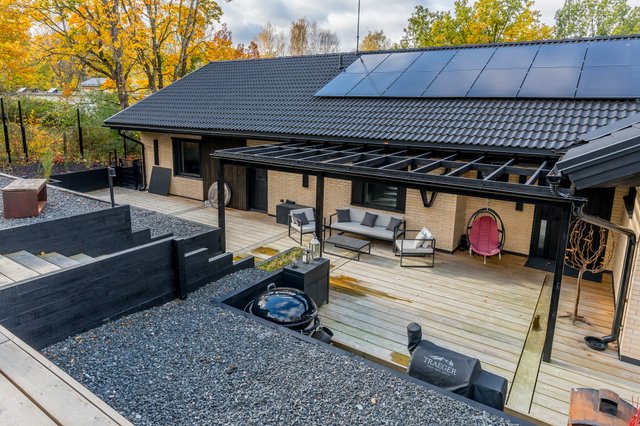 - Takapihalla noin 200m2 terassia. Terassilauta super magnum 38x235 ruskea. Muurit ovat mustaa betonia sekä 100x100 painekyllästettyä puuta joka on värjätty mustaksi. Teräsaita ympäröi tonttia. Betoniperustus mustaa betonia. Liukuportti etupihalla. 3kpl käyntiovea porteissa jossa kaikissa lukot.
