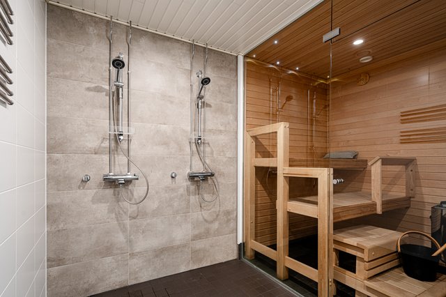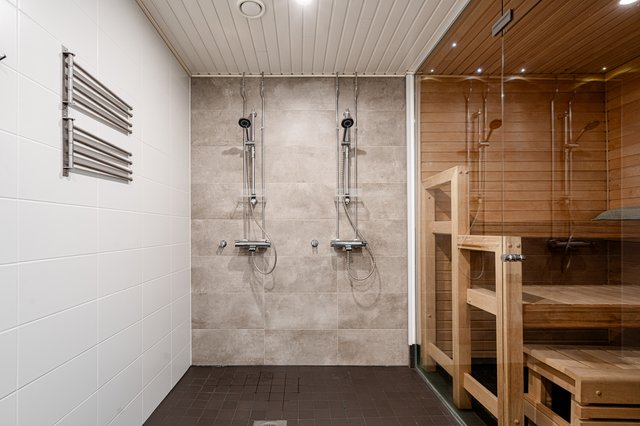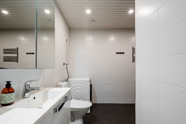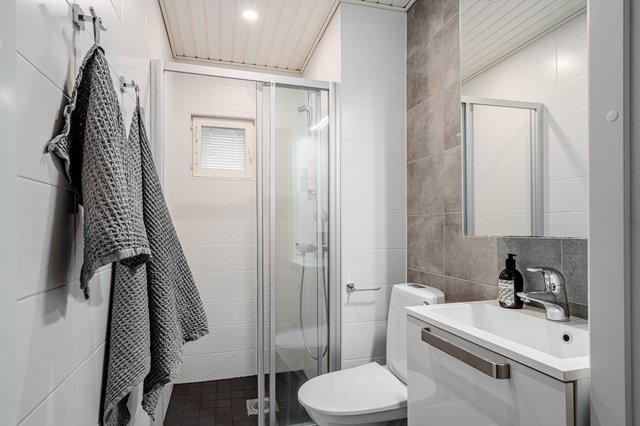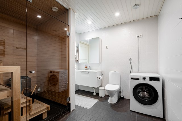 - WC-istuin, bidee-suihku, allaskaappi, pesuallas, peilikaappi, lattialämmitys, pesukoneliitäntä, ja suihku