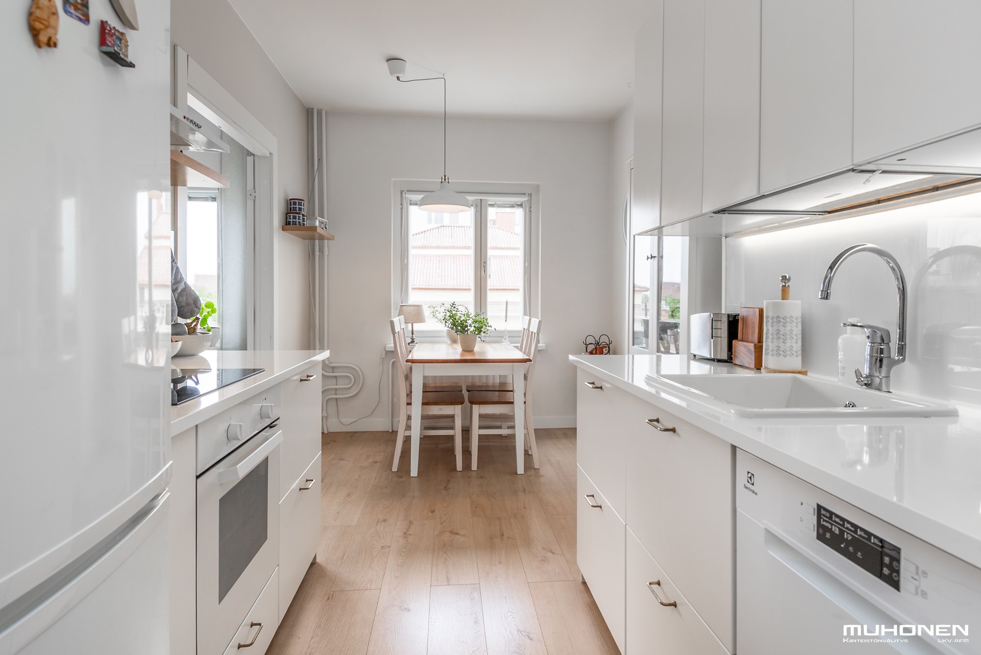 - Jääkaappipakastin, uuni, liesi, liesituuletin, ja astianpesukone