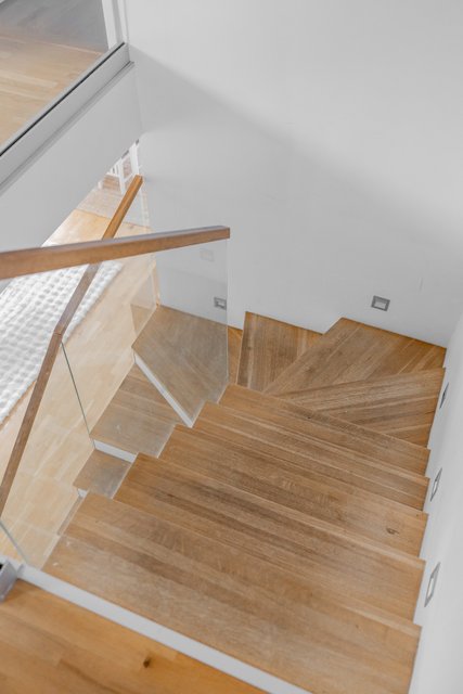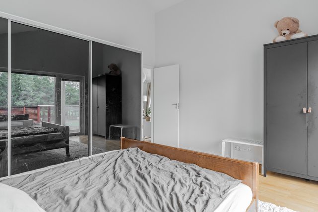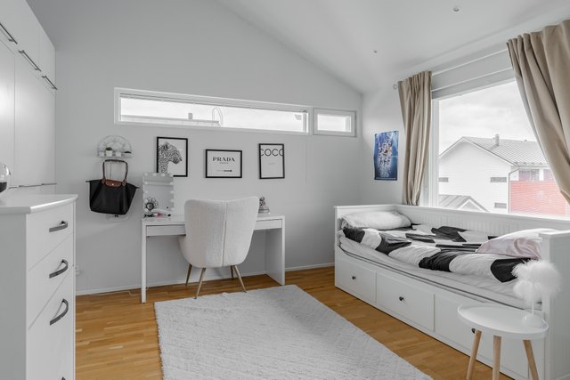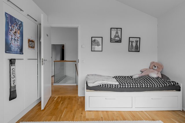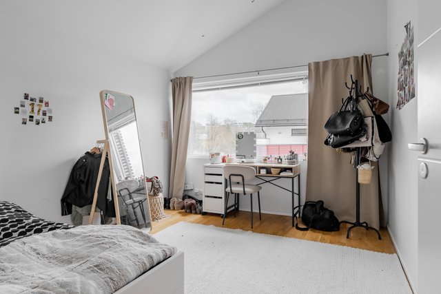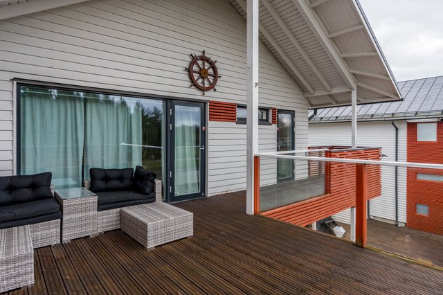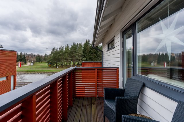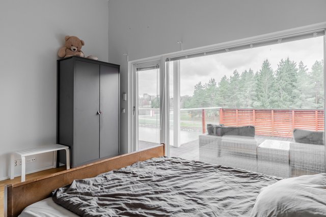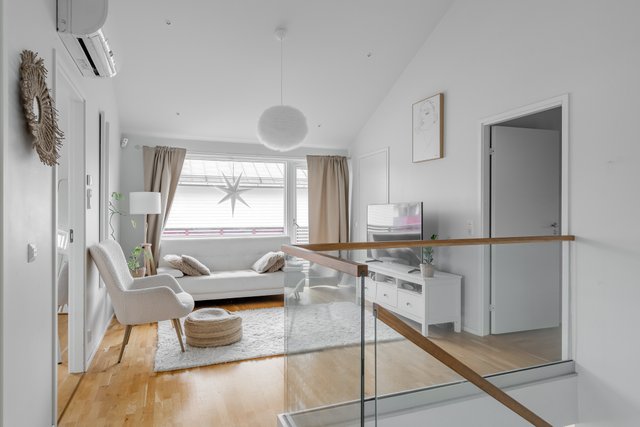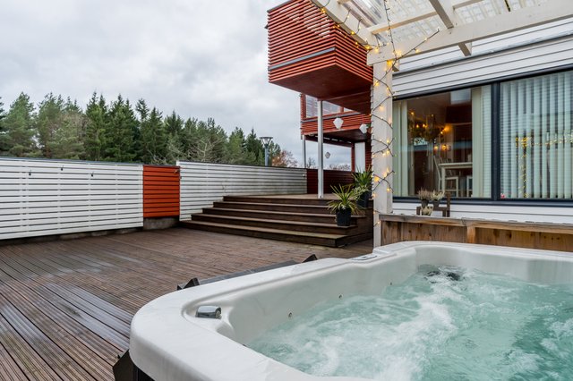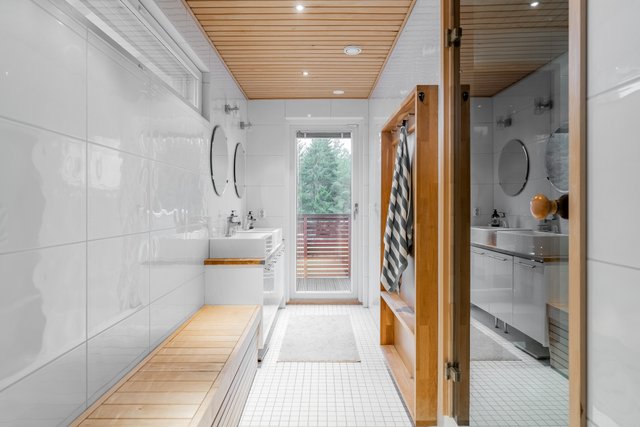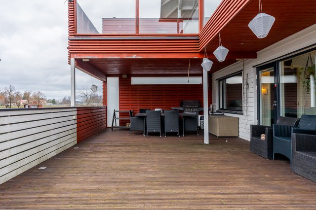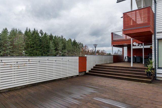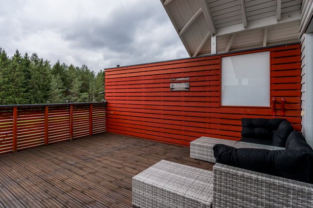 Talossa on neljä makuuhuonetta ja toimiva pohjaratkaisu kahdessa tasossa. Yläkerrassa sijaitsevat kolme makuuhuonetta, 2 kylpyhuonetta, sauna, pukuhuone, TV-olohuone sekä kaksi parveketta. Parvekkeille on käynti sekä päämakuuhuoneesta että pukuhuoneesta. Esteettömät puisto- ja sunttinäkymät avautuvat etelään, ja aurinko kiertää taloa käytännössä koko päivän.