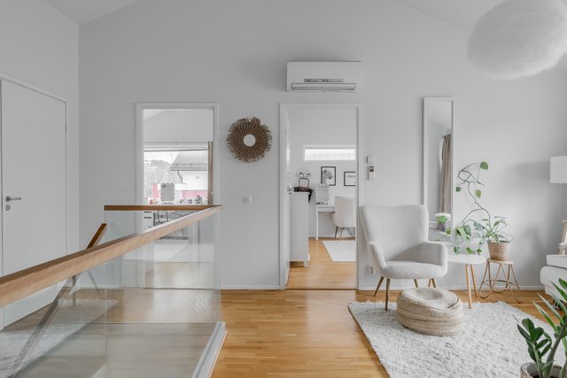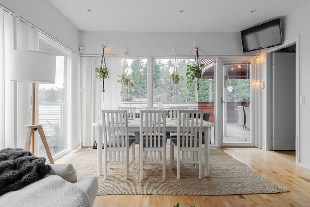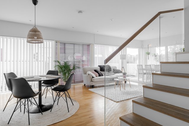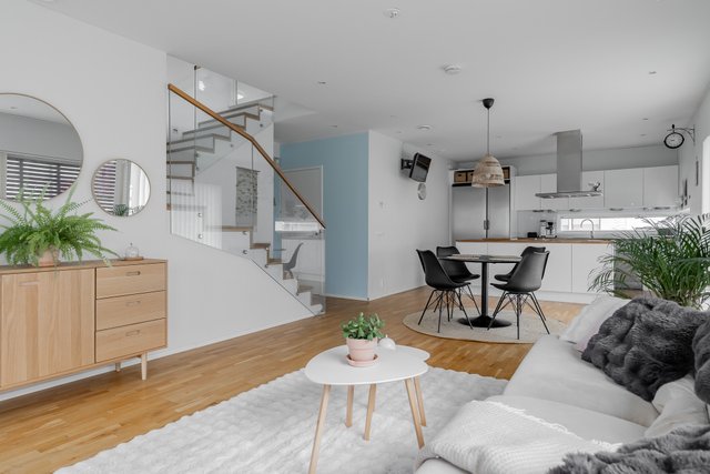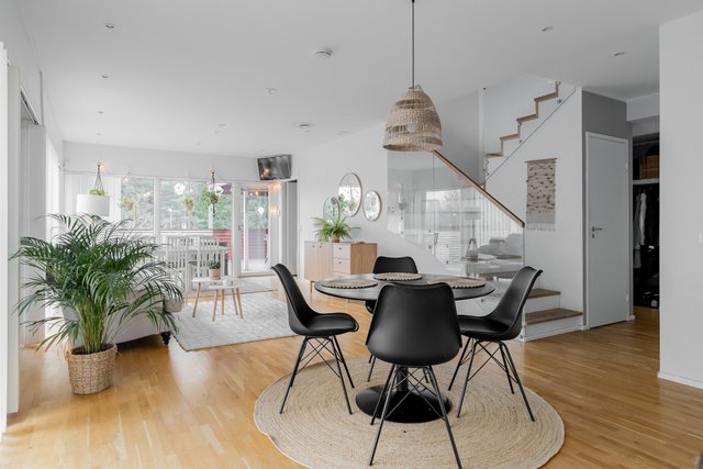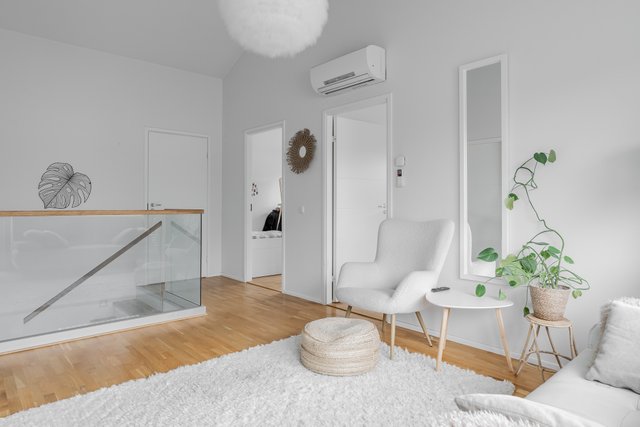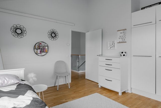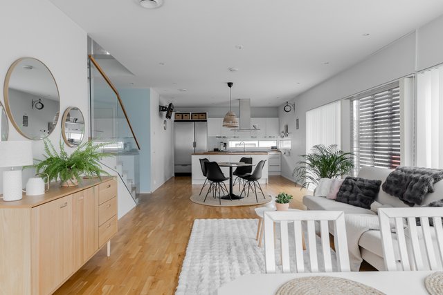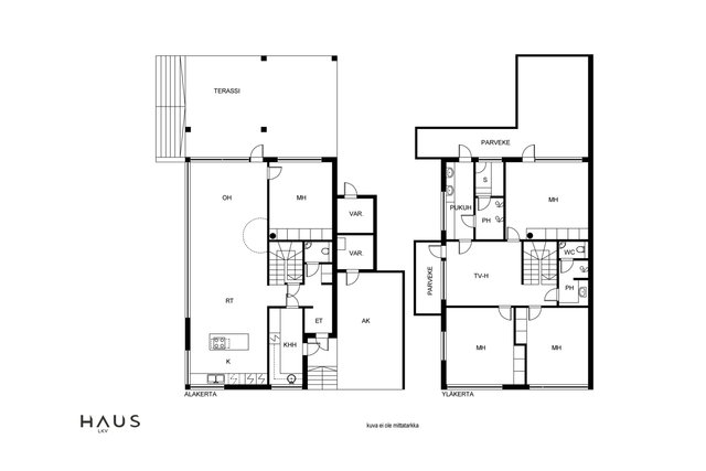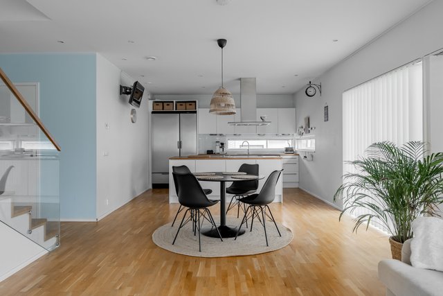 Alakerrassa avara olohuoneen, ruokailutilan ja keittiön muodostama kokonaisuus on todella toimiva. Lisäksi alakerrassa on kodinhoitohuone, erillinen wc, eteinen sekä yksi makuuhuone, joka sopii erinomaisesti myös vierashuoneeksi tai työtilaksi.