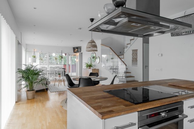 - Jääkaappipakastin, liesi, astianpesukone, keittiösaareke, uuni, ja liesituuletin