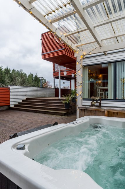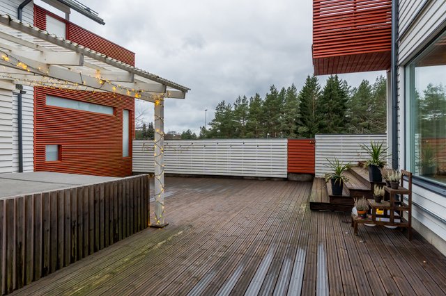 Oma, aidattu ja yksityinen piha on tehty helpoksi: lähes koko piha-alue on katettu terassilla, joten ylläpito on minimaalista ja käyttö maksimaalista. Varastoja on kaksi, joista toinen on lämpöeristetty ja sijaitsee kätevästi sisäpihan yhteydessä.
