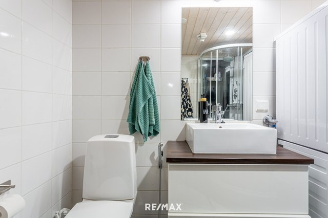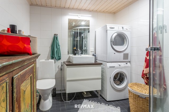 - WC-istuin, suihku, pesukoneliitäntä, lattialämmitys, peili, pesuallas, allaskaappi, ja bidee-suihku