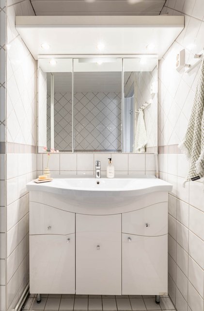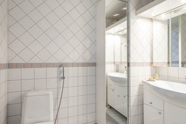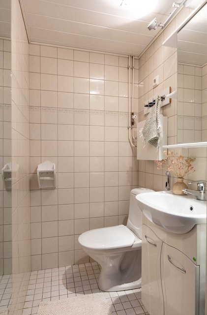 - Alakerta: Kokonaan laatoitettu. Wc, peili- ja allaskaapit, bidee-suihku. Yläkerta: Kokonaan laatoitettu. Wc, peili- ja allaskaapit, bidee-suihku.