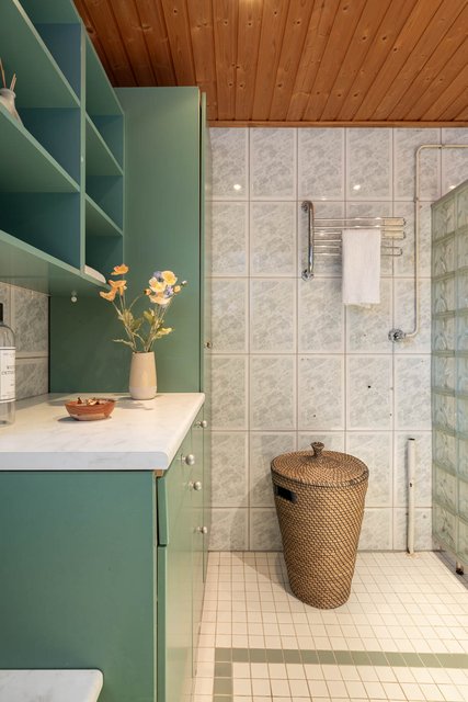 - Kokonaan laatoitettu. Suihku. Pesukoneliitäntä.