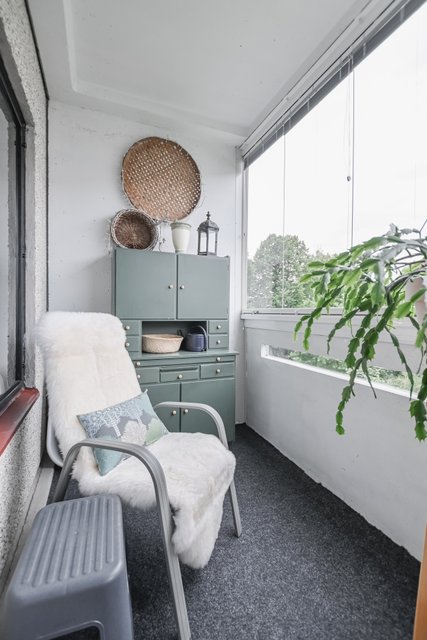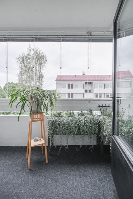 Asunnossa on kaksi makuuhuonetta, tilava olohuone ja keittiö, jossa on modernit kodinkoneet, kuten induktioliesi. Parvekkeelta avautuvat näkymät vehreälle pihalle, ja lasitus tuo lisämukavuutta ympäri vuoden.