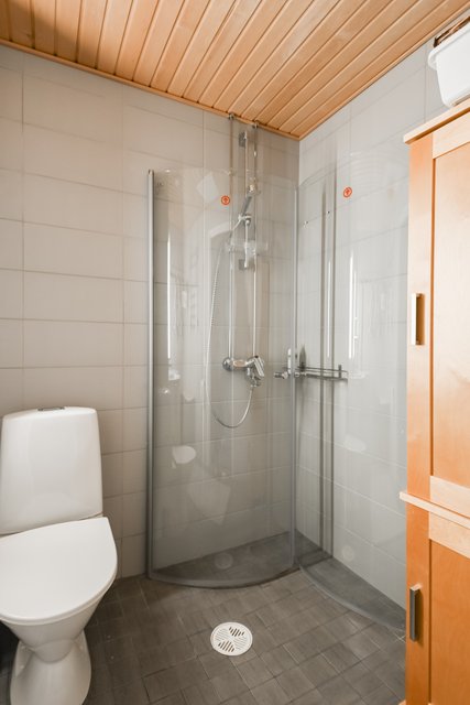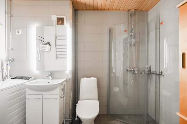 - WC-istuin, suihku, suihkuseinä, lattialämmitys, peilikaappi, allaskaappi, bidee-suihku, ja pesukoneliitäntä