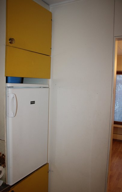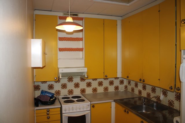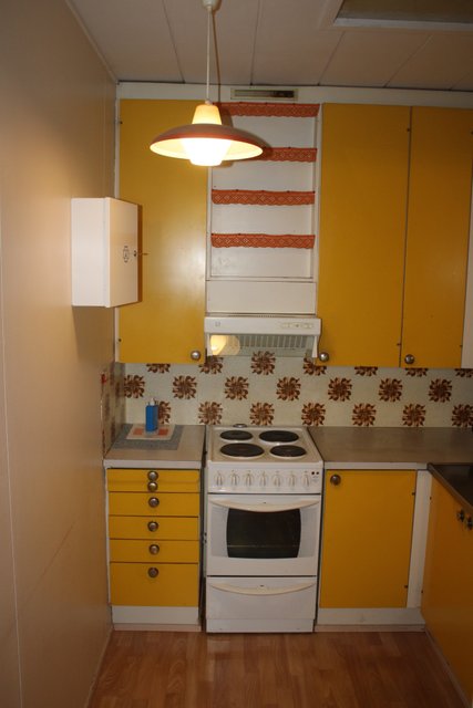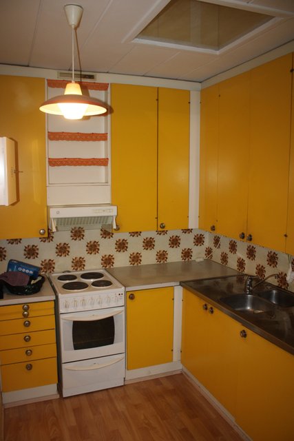 Huoneisto on varsin peruskuntoinen, keittokomero alkuperäisin kiintokalustein, varustettuna jääkaapilla, liesiuunilla, sekä liesituulettimella varustettuna, työtasot laminaattia välitila muovimattoa.