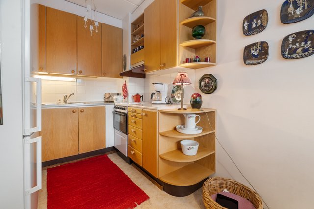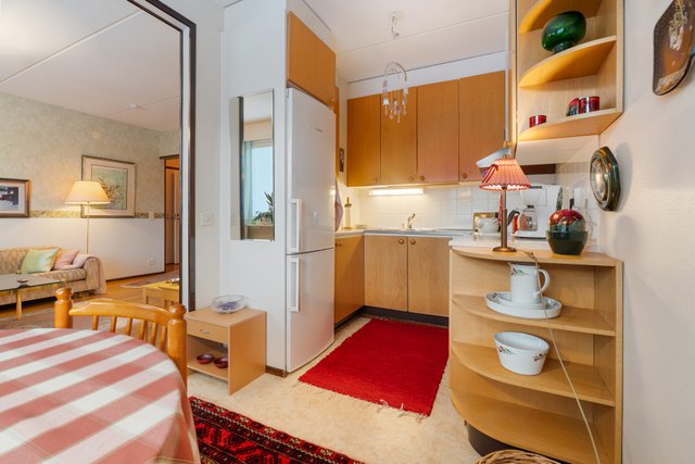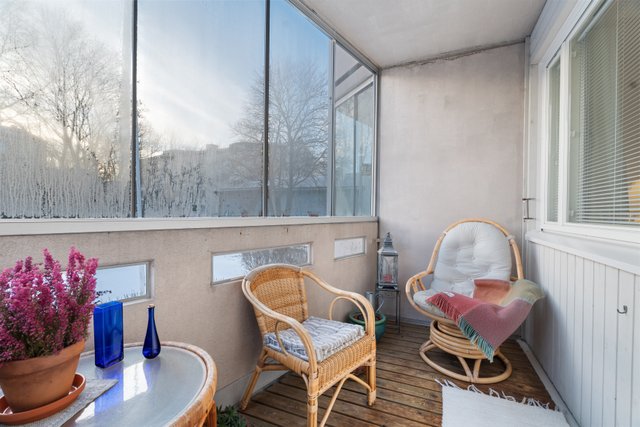 Från det rymliga vardagsrummet utgång till den inglasade balkongen. Köket är utrustat med allt nödvändigt och ligger till vardagsrummet. Rymligt sovrum med klädskåp. I badrummet finns tvättmaskinsanslutning samt egen bastu.