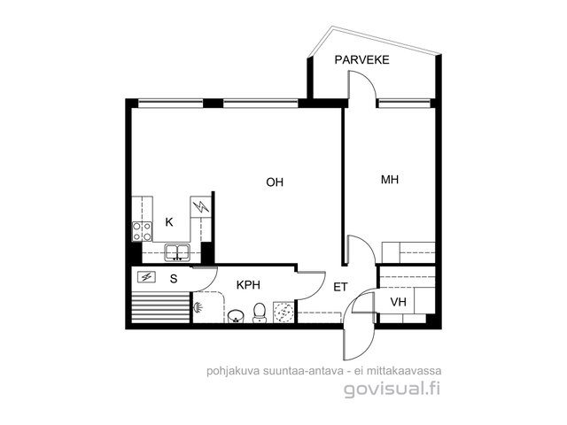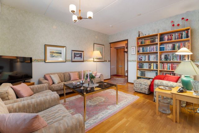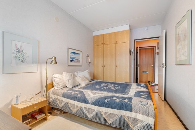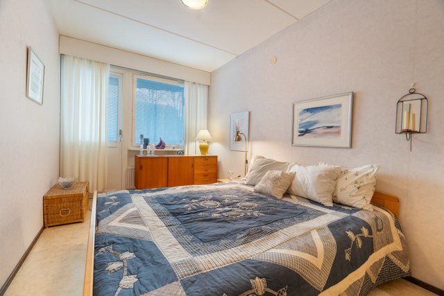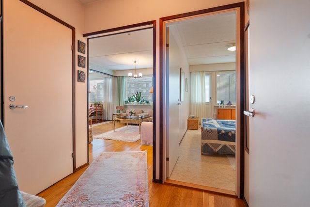 Keittiö avautuu olohuoneeseen ja makuuhuoneessa on tilavat säilytystilat. Olohuoneesta käynti lasitetulle parvekkeelle. Kylpyhuoneessa pesukoneliitäntä. Oma sauna.