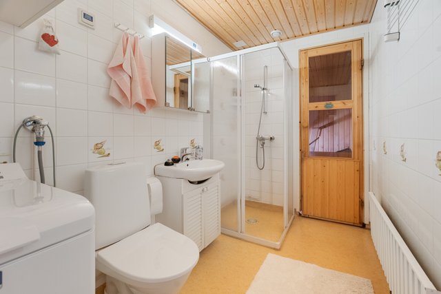 - WC-istuin, suihkuseinä, pesukoneliitäntä, ja peilikaappi