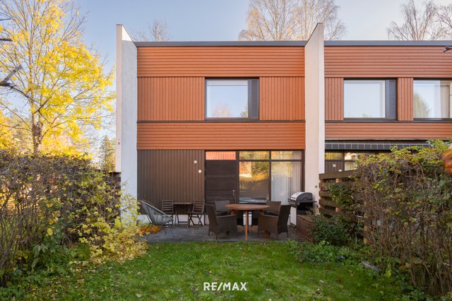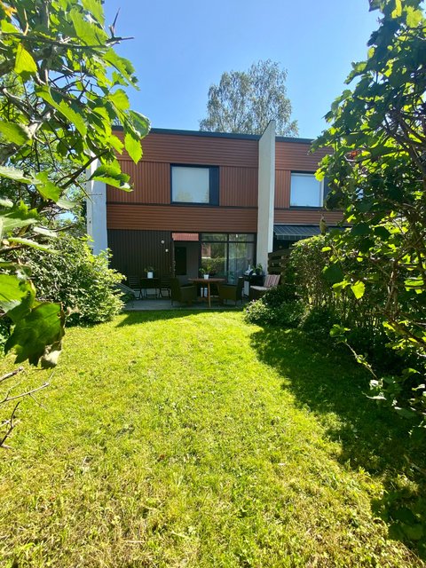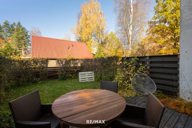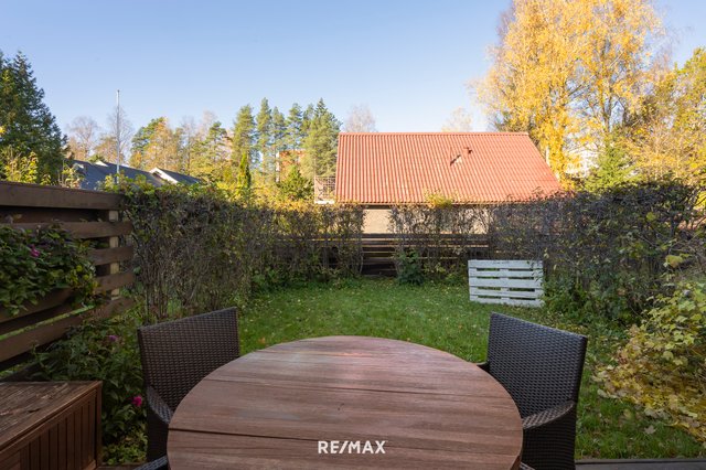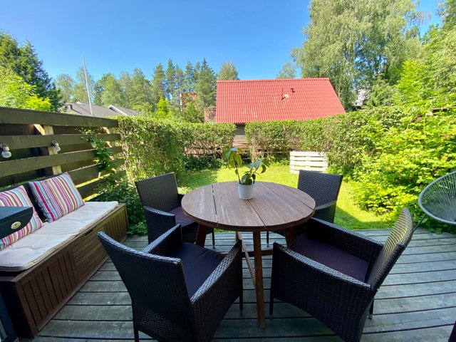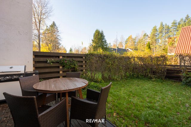 - Asunnon suojaisa terassi avautuu vehreälle pihalle ja tarjoaa miellyttävän oleskelualueen ulkona. Terassilla on hyvin tilaa ruokailuryhmälle ja grillille.