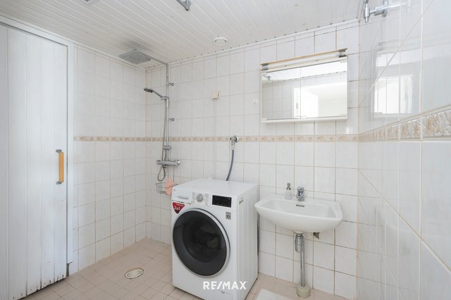 - Varustus: Peilikaappi, pesuallas, pesukoneliitäntä, suihku, kiinteät valaisimet. Lattia: Laatta. Seinät: Kaakeli.