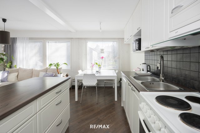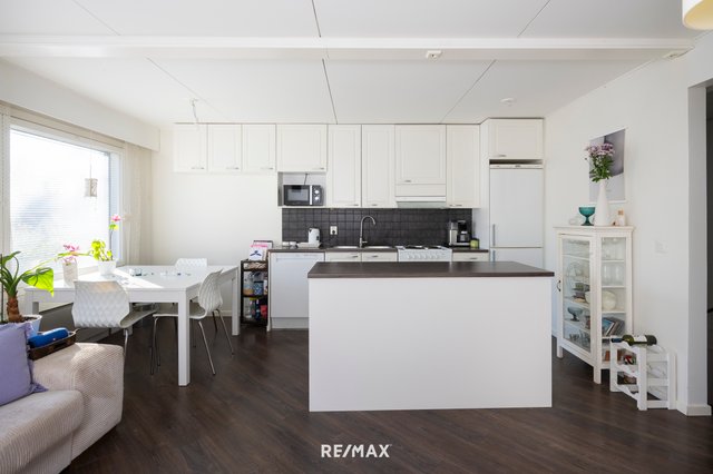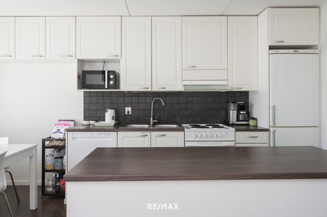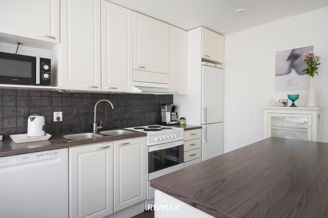- Varustus: Jääkaappi/pakastin, liesituuletin, astianpesukone. Liesi: Valurauta. Työtasot: Laminaatti. Lattia: Laminaatti. Seinät: Maali/ osalaatoitus
