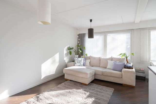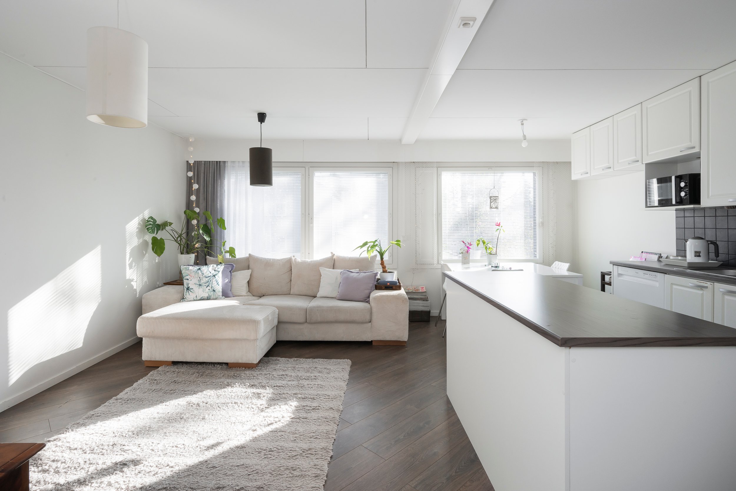 Olohuone, keittiö ja ruokailutila muodostavat yhtenäisen, avaran kokonaisuuden, jossa valo tulvii sisään suurista ikkunoista. Tilat on suunniteltu käytännöllisiksi ja viihtyisiksi, joten arki sujuu täällä mukavasti.