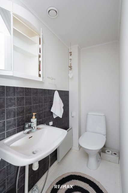 - Varustus: WC-istuin, peilikaappi, pesuallas, bidee-suihku. Lattia: Laatta. Seinät: Kaakeli, maali.