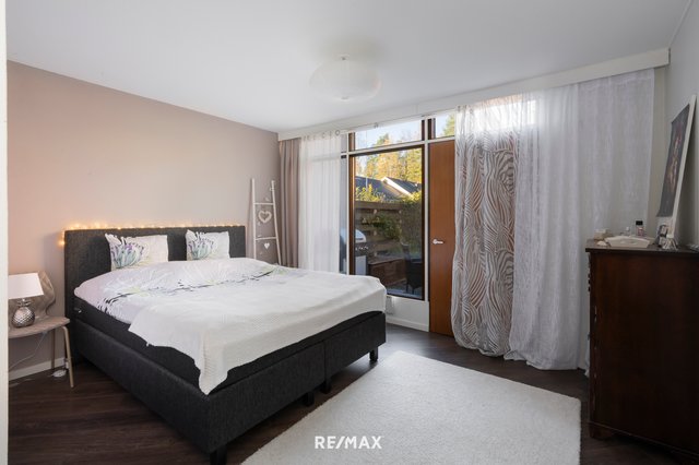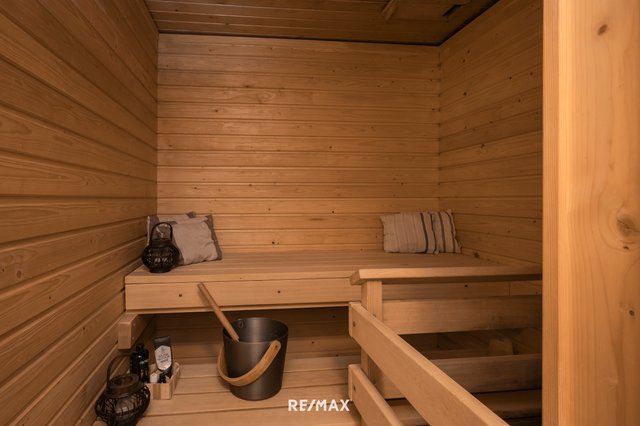 Yläkerrasta löytyvät myös makuuhuone, kylpyhuone ja sauna tarjoavat oman rauhallisen rentoutumisalueensa. Alakerrassa sijaitseva toinen makuuhuone sopii mainiosti esimerkiksi työtilaksi tai vierashuoneeksi ja sieltä on käynti suojaisalle takapihalle.