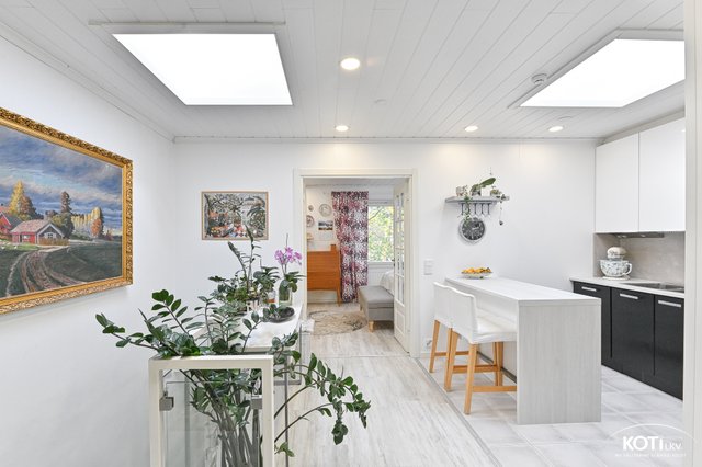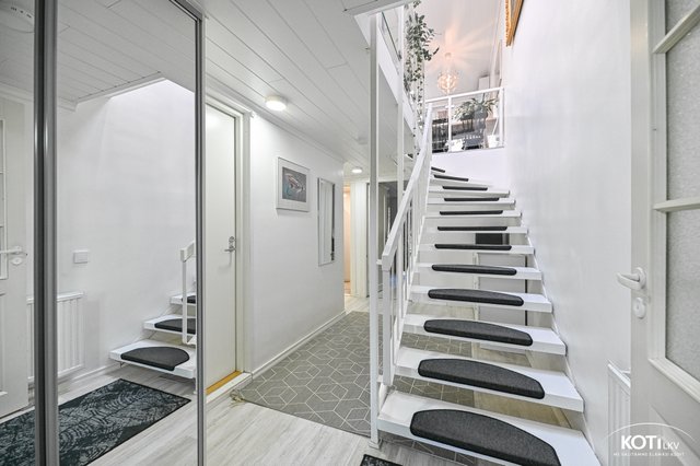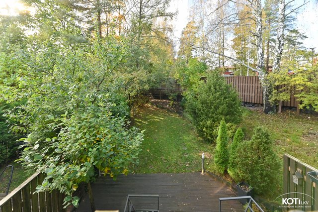 Yläkerran olohuoneesta on käynti parvekkeelle, josta avautuvat näkymät omalle pihalle. Keittiössä on saareke, mikä tuo lisää työskentelytilaa ja modernia ilmettä. Yläkerrassa myös makuuhuone, jossa vaatekaapit. Sisäänkäyntikerroksesta löytyy kylpyhuone- ja saunaosasto, erillinen wc, sekä huone, josta käynti terassille ja pihalle. Pihan suunta on noin lounaaseen, sieltä löytyy terassi, nurmikkoa ja istutuksia. Piha on aidattu. Asunnon eteisestä on suora käynti entiseen autotalliin, joka tällä hetkellä toimii harrastetilana.