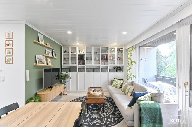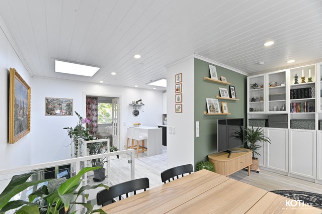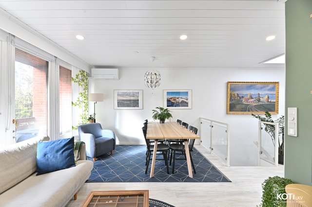 - Olohuone yläkerrassa. Olohuoneesta käynti parvekkeelle, josta näkymät pihalle.