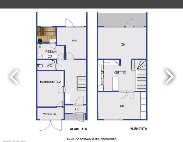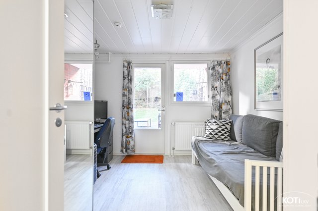 - Makuuhuone yläkerrassa. Seinät maalattu ja yksi seinä tapetoitu. Alakerrassa myös huone, josta käynti pihalle. Seinät maalattu.