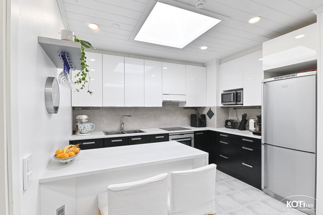 - Jääkaappipakastin, astianpesukone, liesi, uuni, ja keittiösaareke