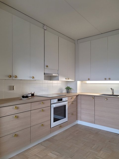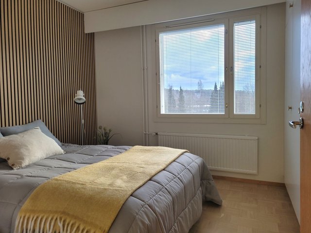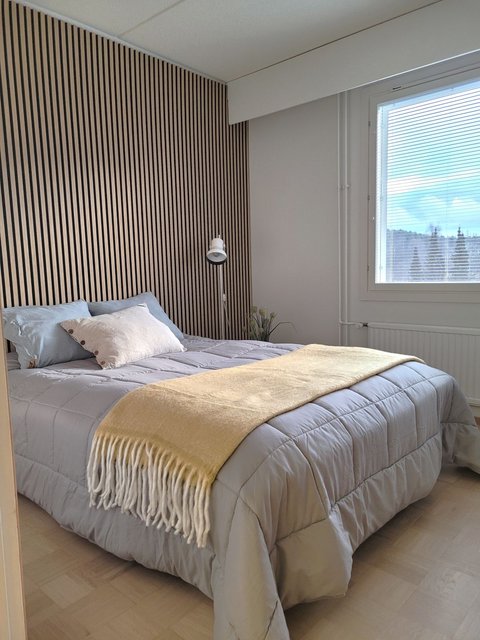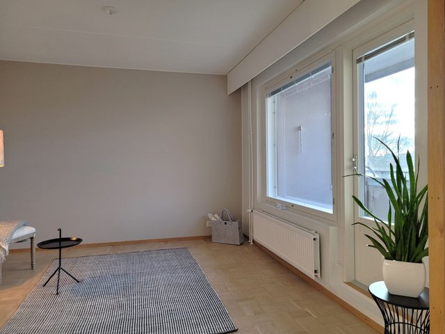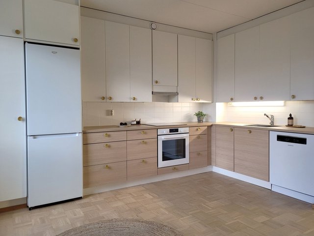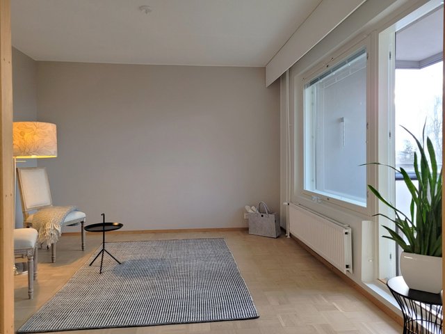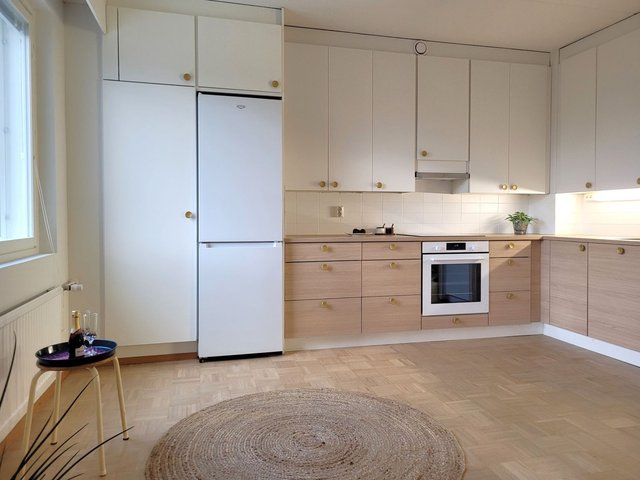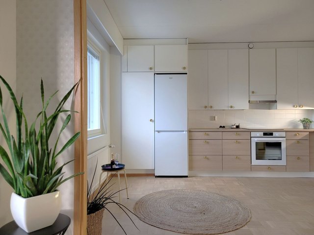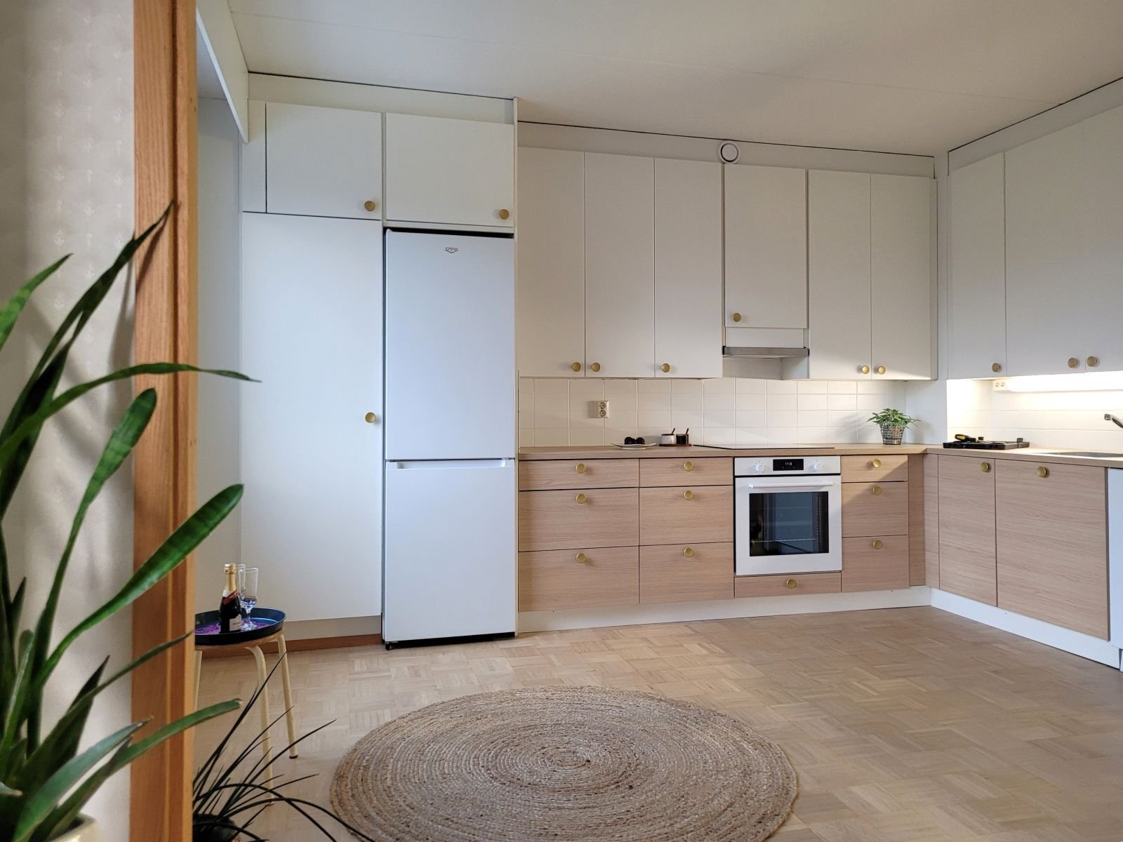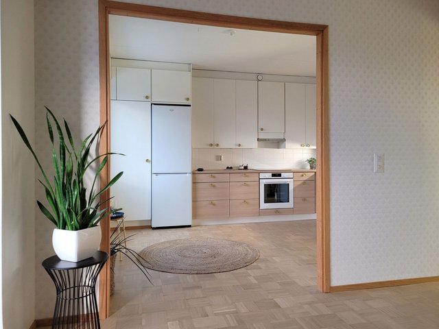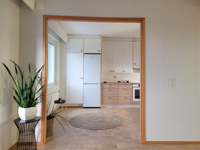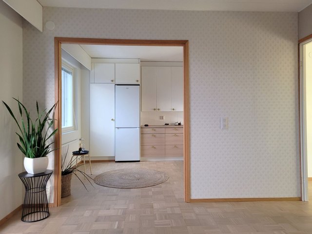 Poikkeuksellisen tilava keittiö tarjoaa runsaasti kaappi- ja laskutilaa sekä toimivuutta vaativampaankin makuun. Myös isollekin ruokapöydälle on tilaa. Keittiö avautuu olohuoneeseen luoden tiloista miellyttävän yhtenäisen kokonaisuuden. Makuuhuoneessa uudet pinnat luovat rauhallisen ja levollisen tunnelman.