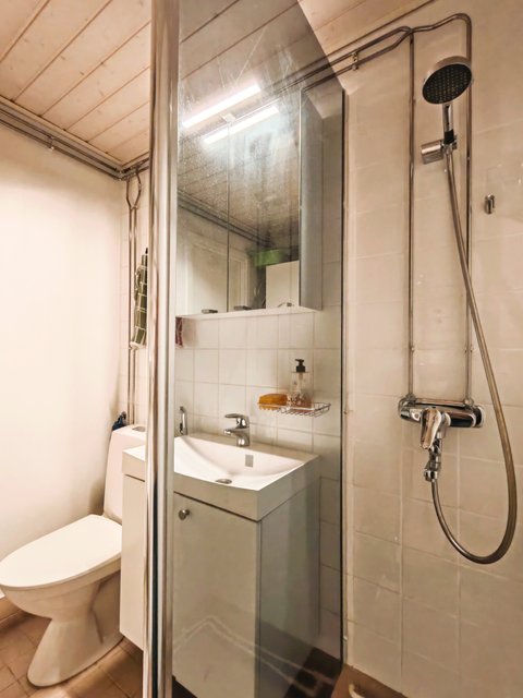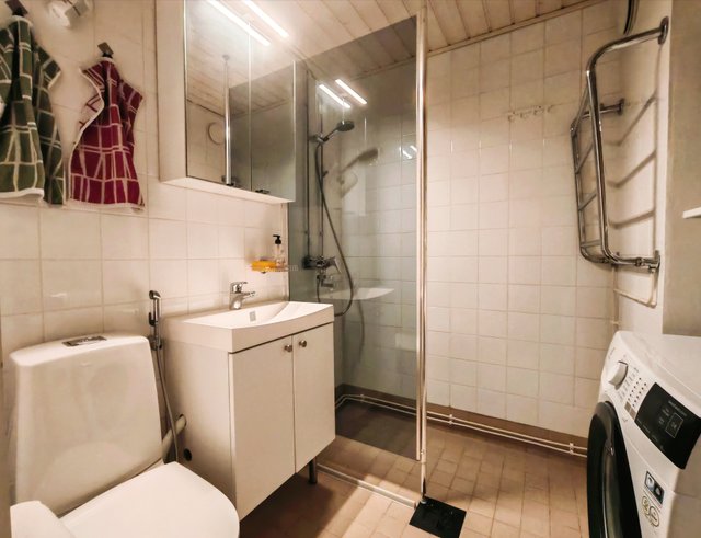 - WC-istuin, bidee-suihku, peilikaappi, suihkuseinä, suihku, pyyhekuivain, pesukoneliitäntä, ja allaskaappi