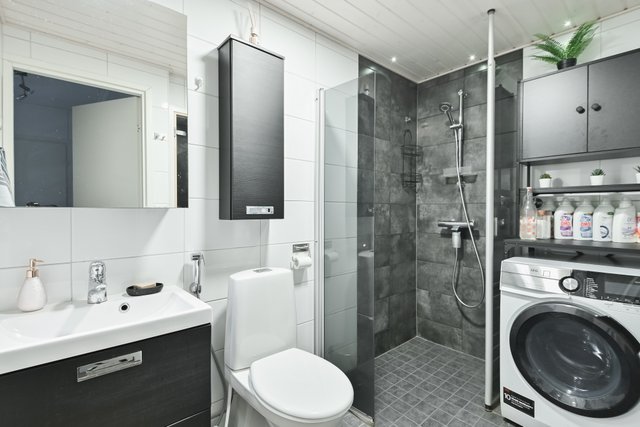 - WC-istuin, suihku, suihkuseinä, pesukoneliitäntä, peilikaappi, allaskaappi, pesuallas, ja bidee-suihku