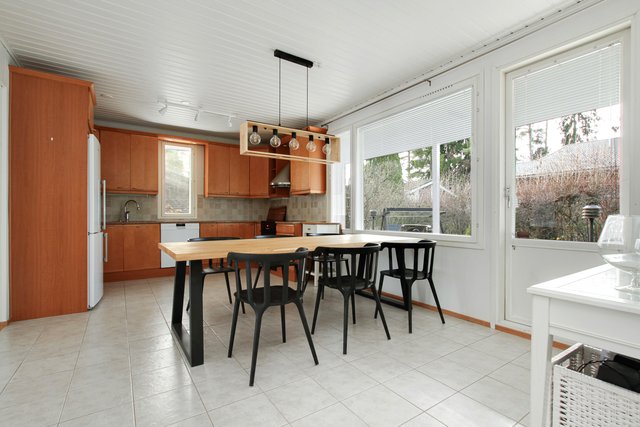 Keittiö on rakennettu 2004 ja tarjoaa erinomaisen tilan suuremmallekin ruokailuryhmälle. Kesäpäivinä kattauksen voi siirtää kätevästi terassin puolelle.