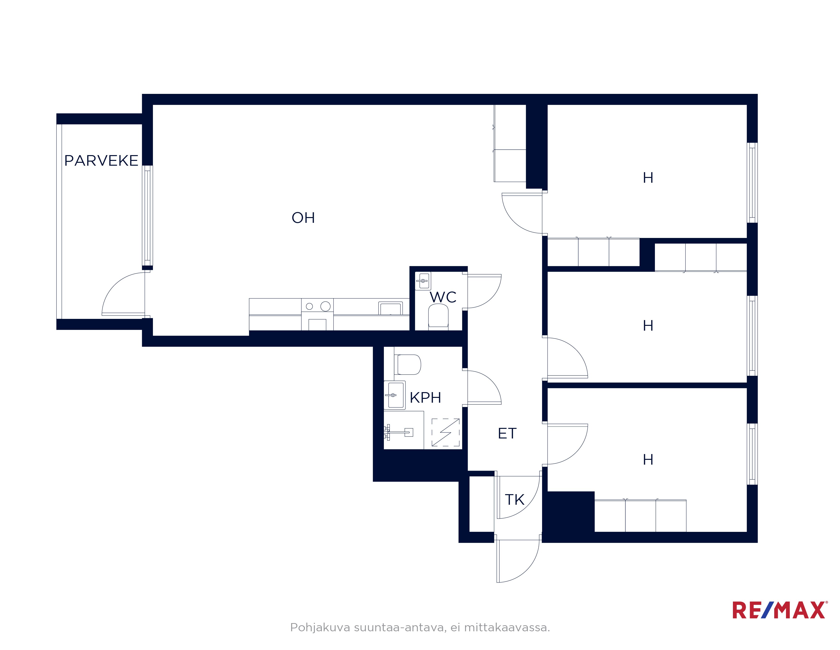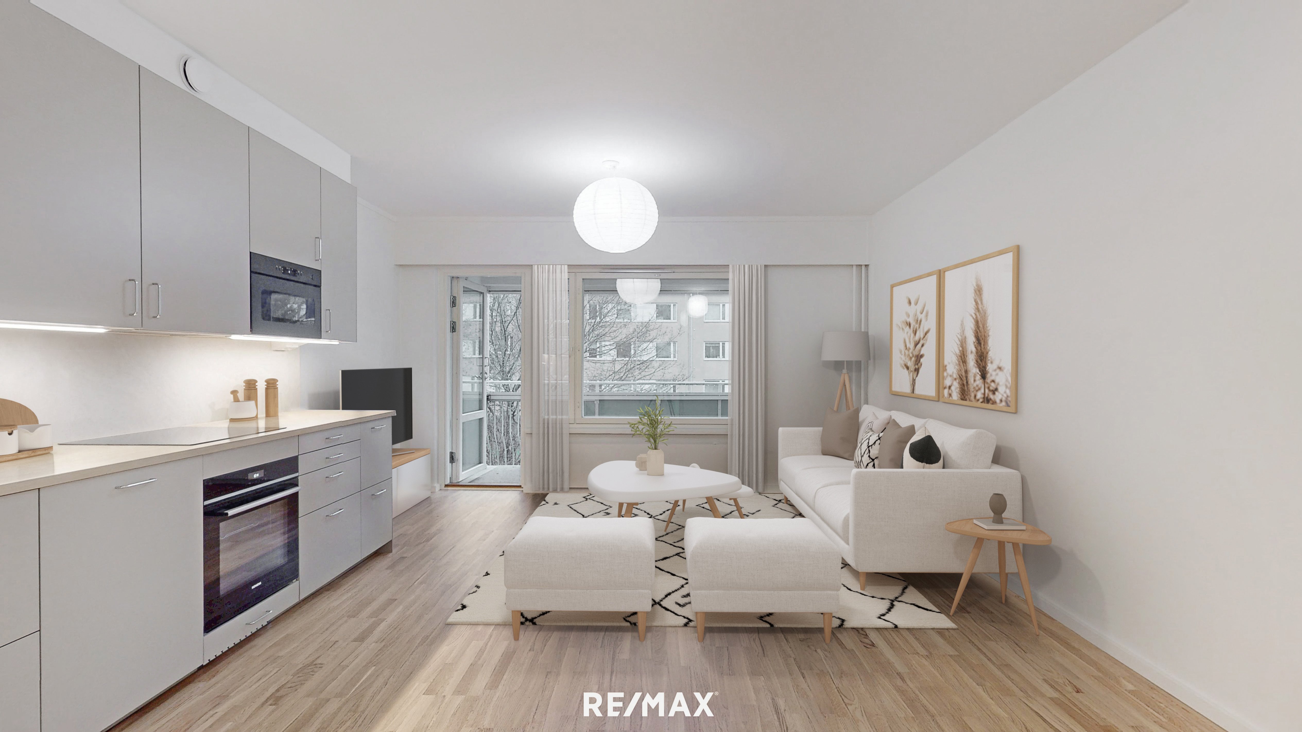 Huoneiston pohjaratkaisu on käytännöllinen ja kutsuva. Kolme mukavan kokoista makuuhuonetta avautuvat kaakkoon aamuauringon suuntaan, ja olohuoneen sekä avokeittiön muodostama lähes 28 m² yhtenäinen tila tarjoaa runsaasti valoa ja avaruutta arjen ja juhlan hetkiin. Olohuoneesta avautuu käynti tilavalle, lasitetulle parvekkeelle, joka jatkaa oleskelutilaa ulos. Tyylikkäästi saneerattu kylpyhuone, pesutornivaraus ja erillinen wc viimeistelevät toimivan kokonaisuuden.